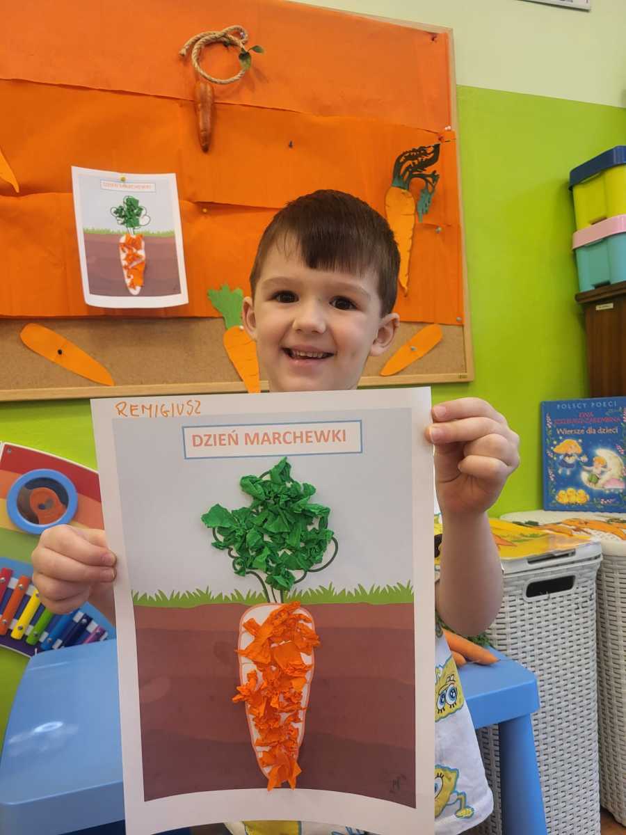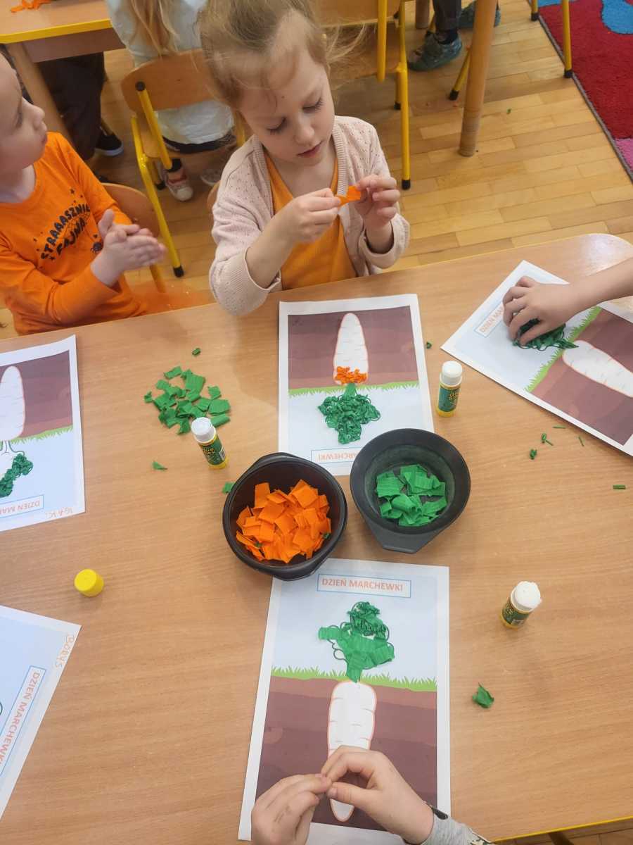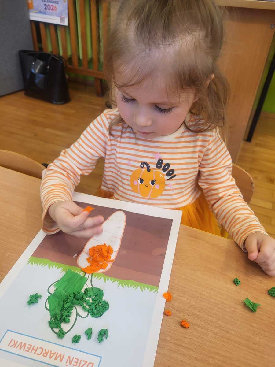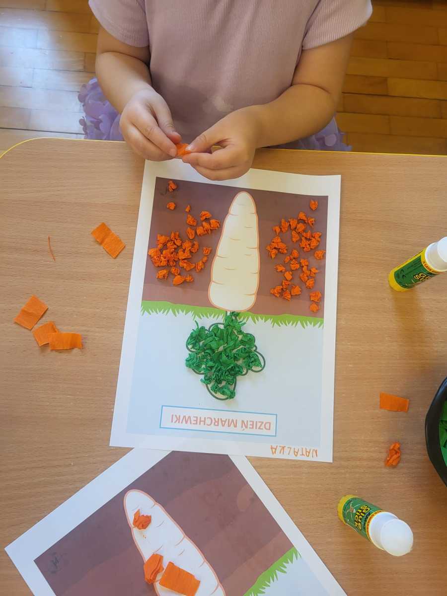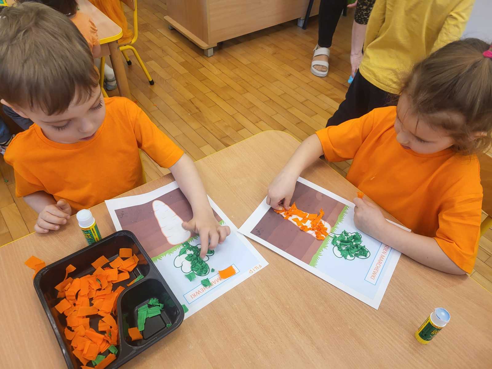Nie zabrakło również aktywności plastycznych, które wspierały rozwój umiejętności manualnych. Dzieci z ogromnym zaangażowaniem wyklejały i tworzyły własne marchewkowe dzieła sztuki, rozwijając przy tym swoją kreatywność.