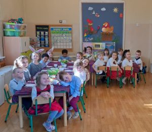 W naszym przedszkolu odbyło się uroczyste śniadanie wielkanocne. Na świątecznym stole nie mogło zabraknąć jajka, szyneczki, baranka z ciasta stroików z bazi i bukszpanu. Śniadanko zostało rozpoczęte wspólnym składaniem sobie życzeń świątecznych następnie zasiedliśmy do pięknego stołu zastawionego pokarmami wielkanocnymi. Ten dzień miał wyjątkowy charakter; dzieci śpiewały piosenki świąteczne i bawiły się w zabawy związane z tradycjami wielkanocnymi. Spotkanie przy wspólnym świątecznym stole sprawiło dzieciom wiele radości.