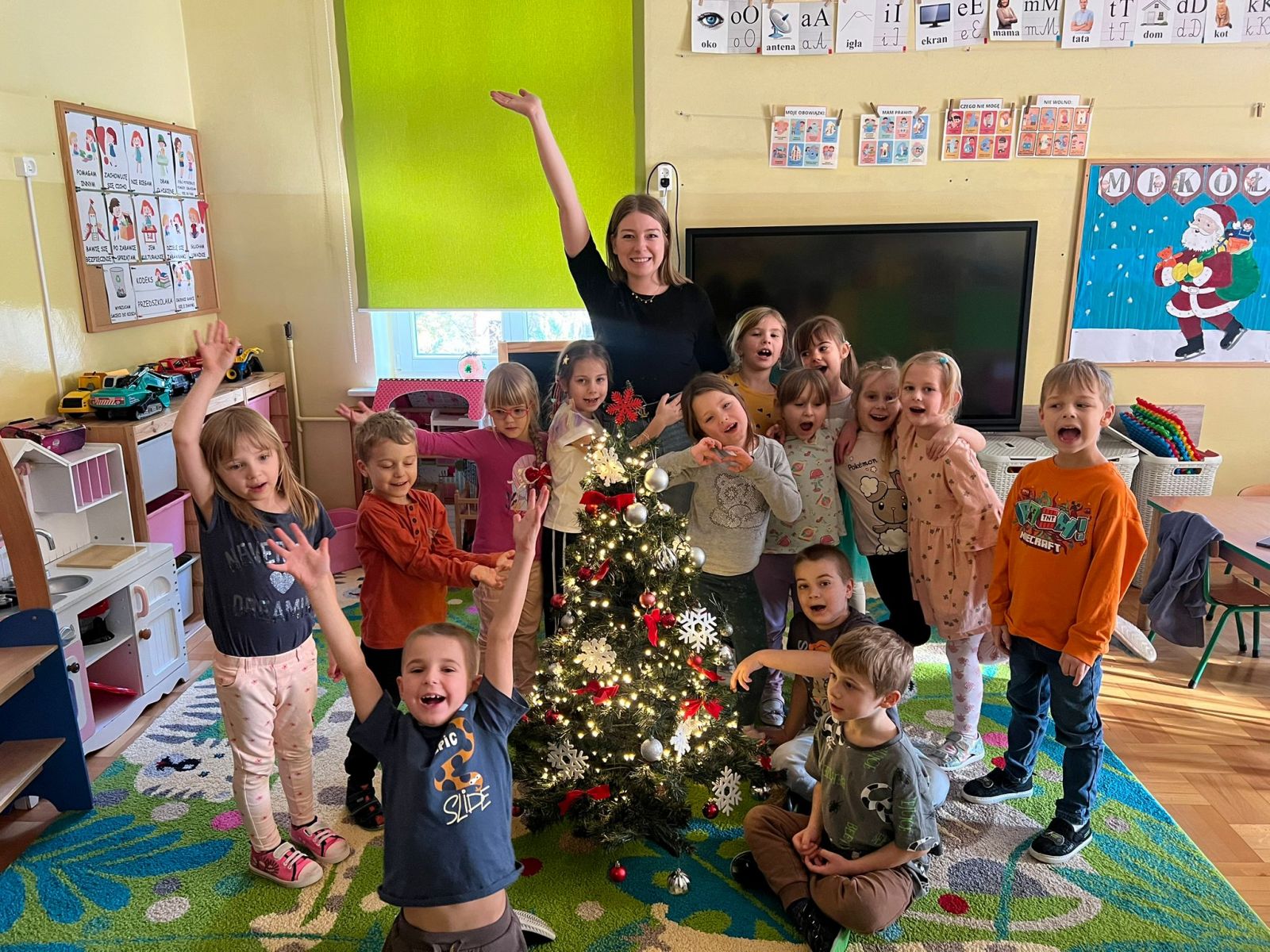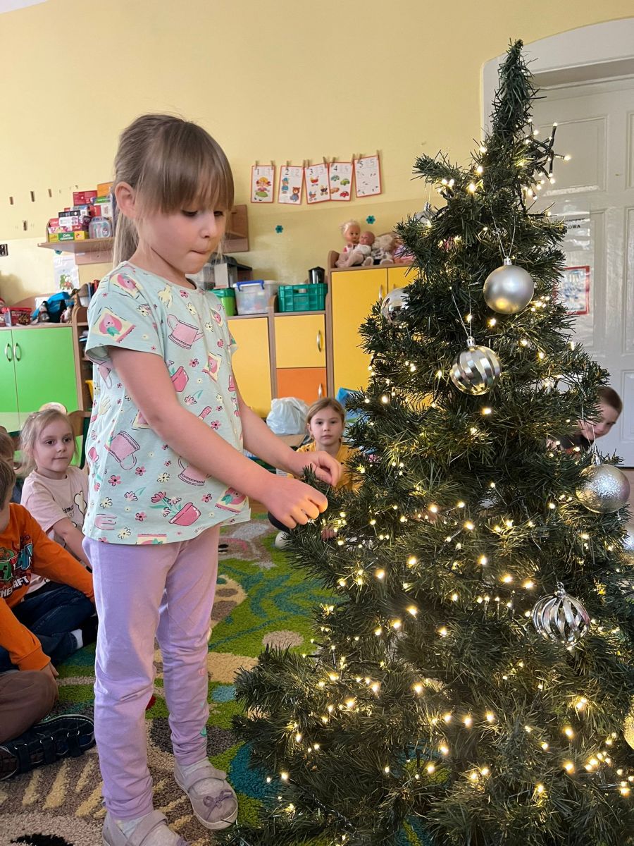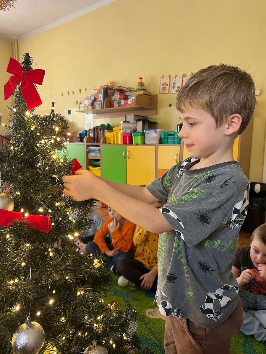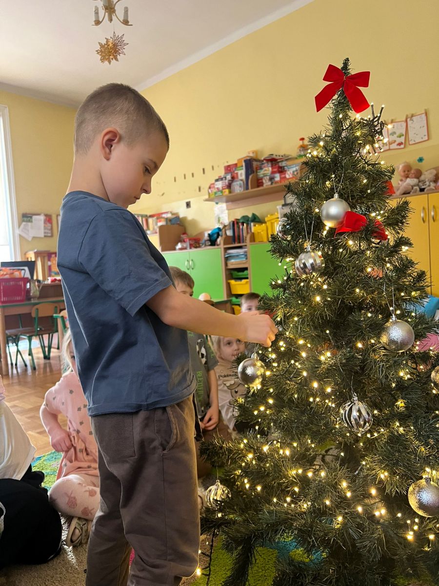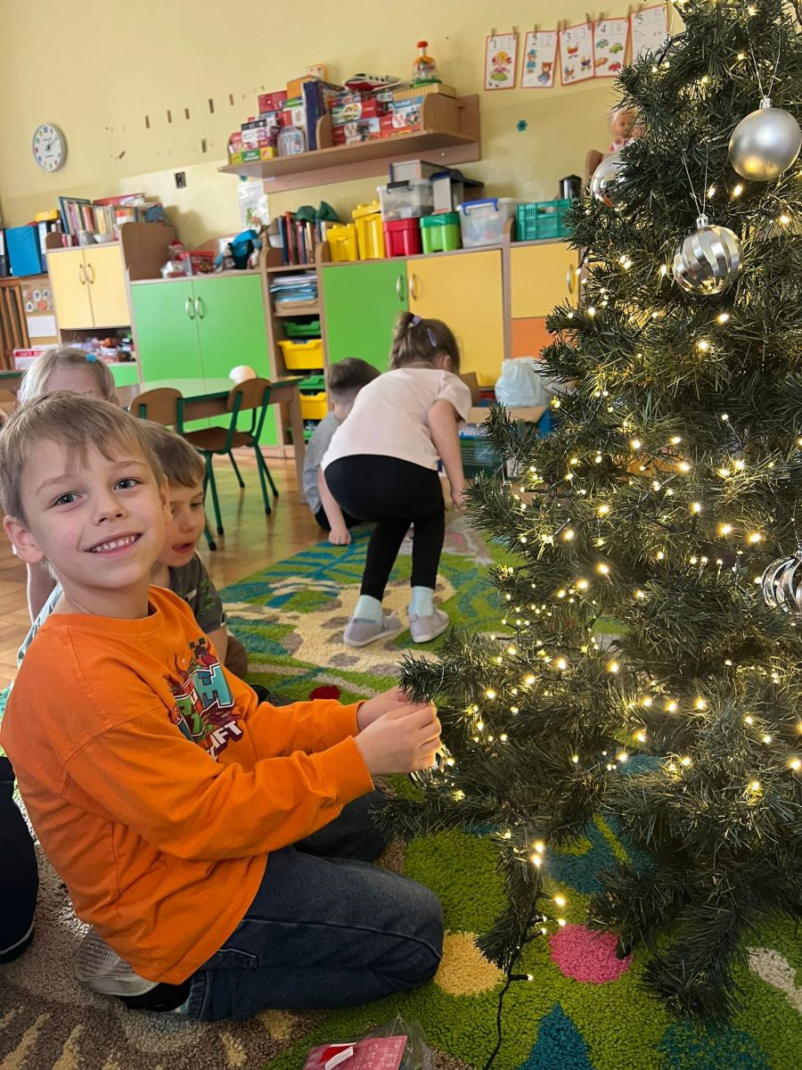 Przedszkolaki z ogromnym zaangażowaniem wybierały ozdoby, zawieszały kolorowe bombki oraz łańcuchy Każdy chciał dodać coś od siebie, dzięki czemu nasza choinka jest wyjątkowa i pełna dziecięcej radości.