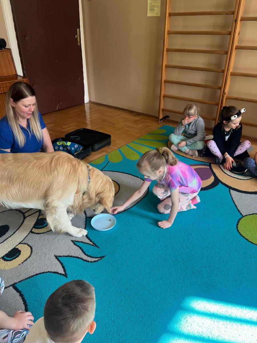 Przedszkolaki miały również okazję obserwować krótką prezentację umiejętności psa oraz zobaczyć, jak reaguje on na polecenia swojego opiekuna.